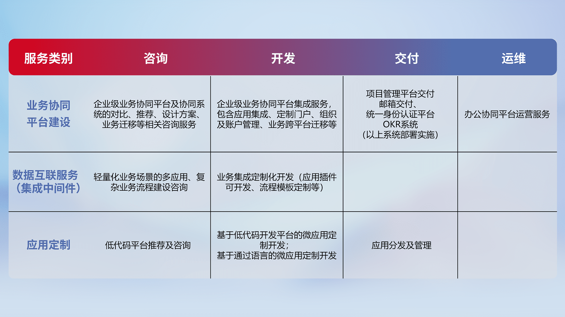 针对钉钉、、企微、、、IDaas等平台级产品提供产品的规划、、、、方案、、、交付、、、定制化开发等服务,,实现如统一协同办公、、、、智能客户服务、、混合会议管理、、、、智能数据查询、、、等业务场景,,,实现数字化转型。。。。