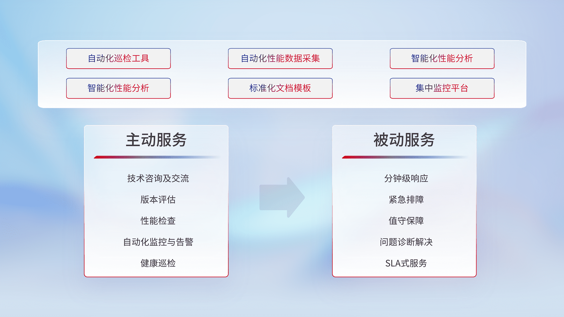 智能化工具和标准化文档,,,,保障服务质量,,,,提供主动服务(包含技术咨询、、版本评估、、性能检查、、自动化监控与告警、、健康巡检)和被动服务包含(分钟级响应、、、、紧急排障、、、、值守保障、、、问题诊断解决、、SLA服务)。。